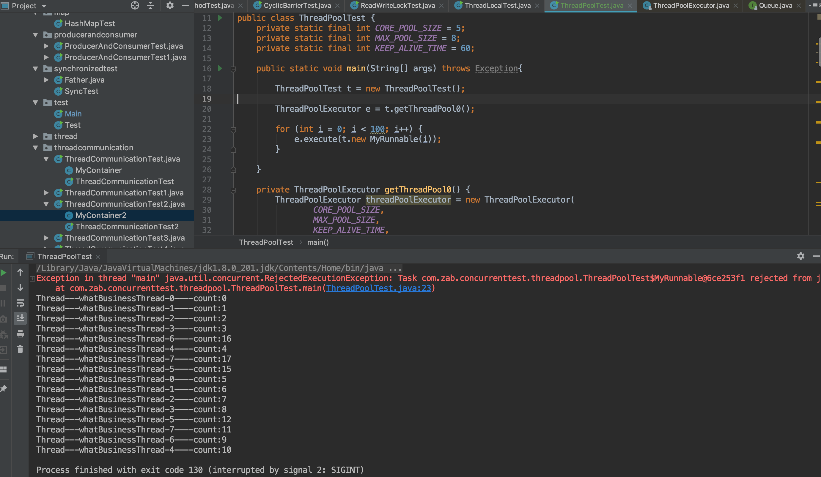 可以看到核心线程数5,最大线程数8,循环执行100次,当核心线程数满了后,再来新的线程,就会往等待队列里放,这里的等待队列是一个ArrayBlockingQueue,容量是10,再来线程满了后,会创建【帮工线程】,可以看到线程名最大是7,说明该测试已经把【帮工线程】都用上了,再来线程就会执行拒绝策略,可以看到控制台有抛异常。