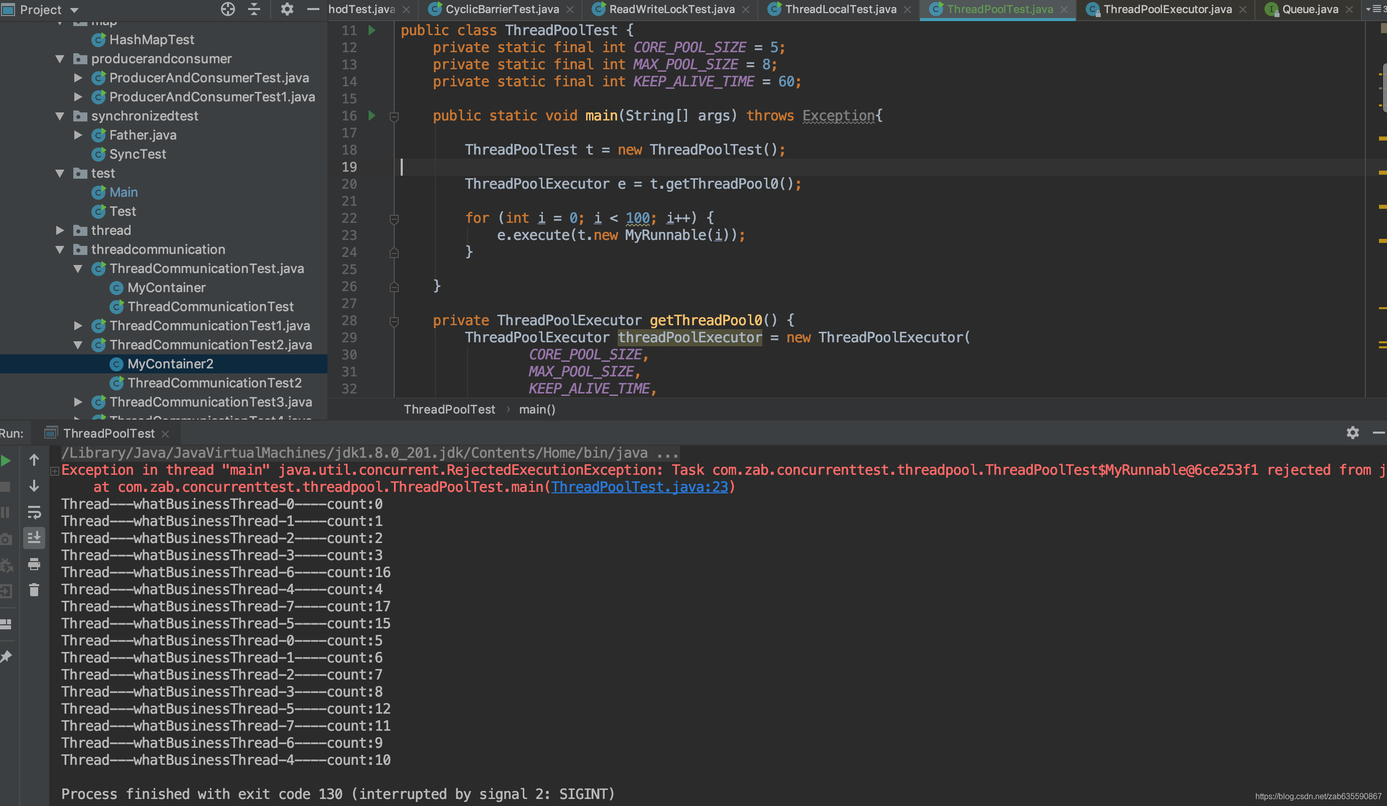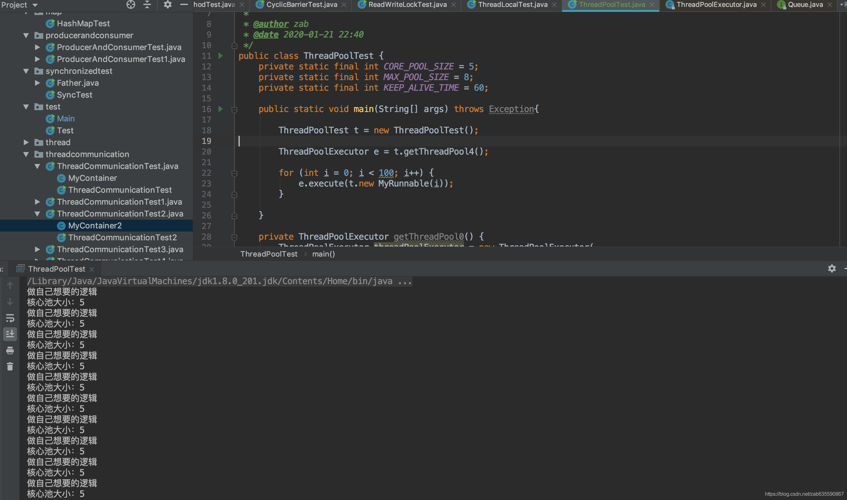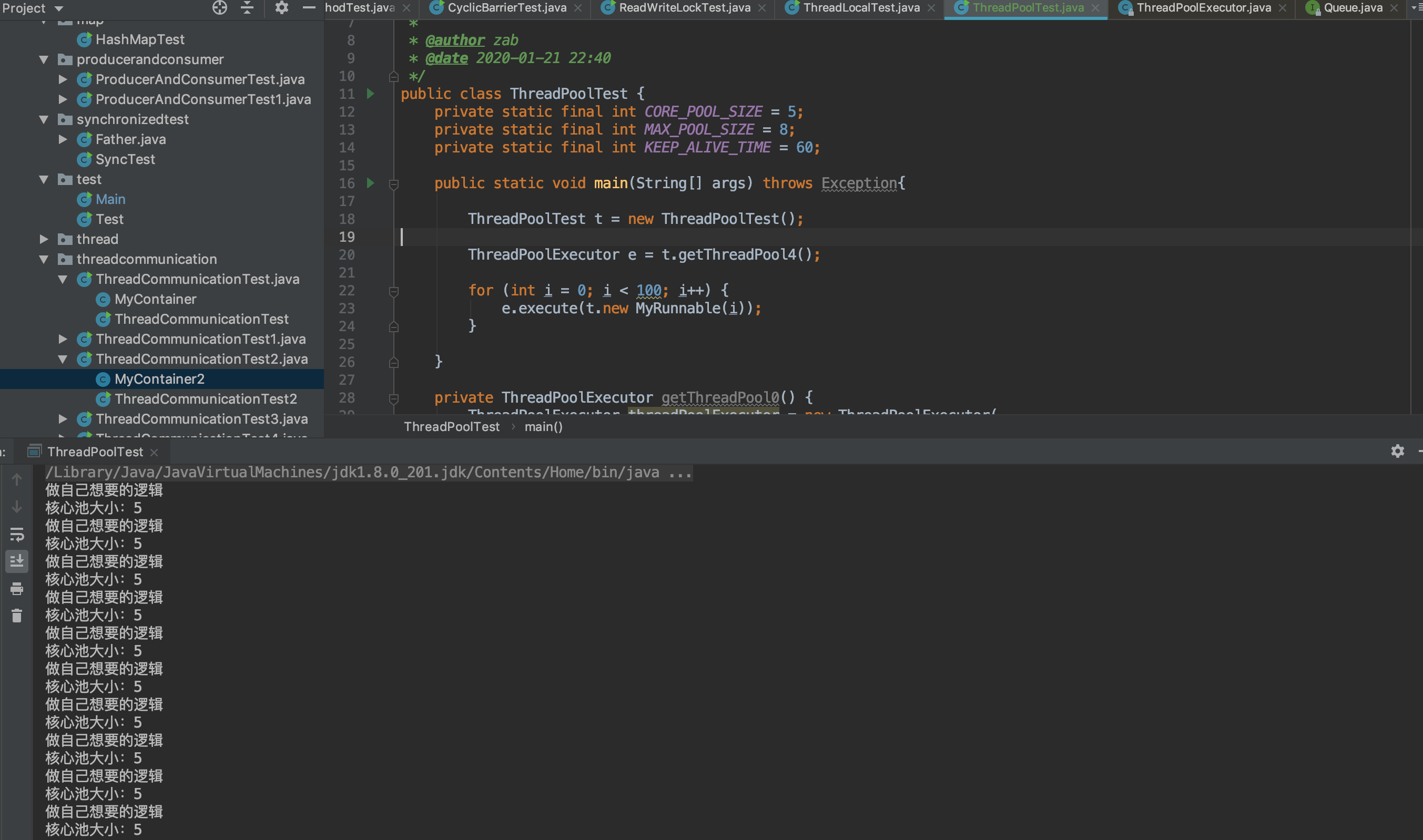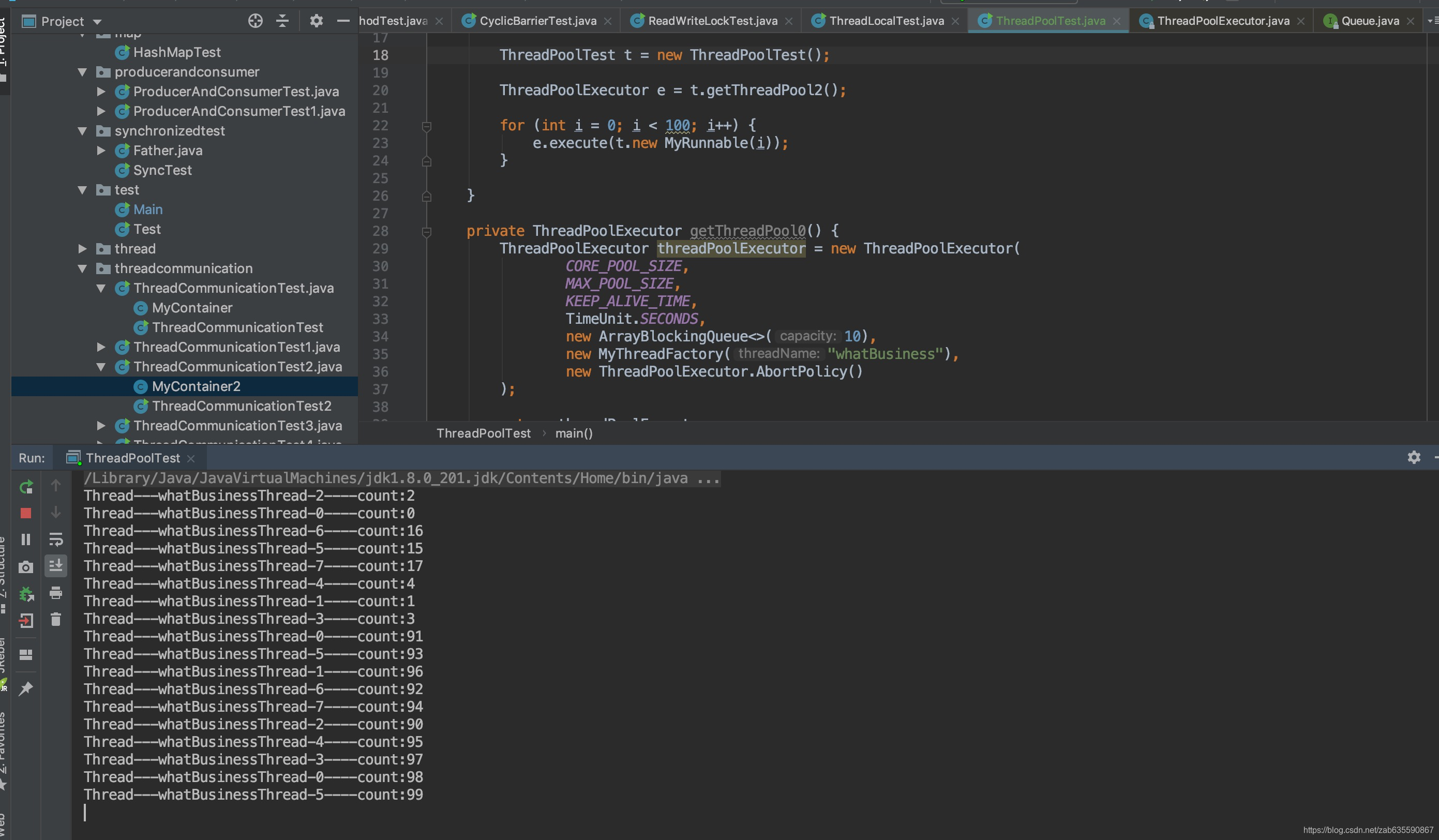 main方法很简单,就是获取不同的线程池,for循环跑100次,然后撑爆线程池的等待队列,测试不同拒绝策略的表现。