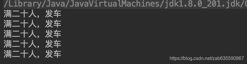 模拟一个场景,我们去公司上班,会在某个地方等公司班车,班车司机会先后到达乘车点,装满一车人就会开往公司。这个类似于CyclicBarrier的作用,一个新起的线程(一个人)过来遇到await方法,就会阻塞(坐车上等着),但是阻塞到循环屏障定义的次数(理解为装满人了)后,就放行所有线程(发车了),并且调用定义的方法。输出的结果是: