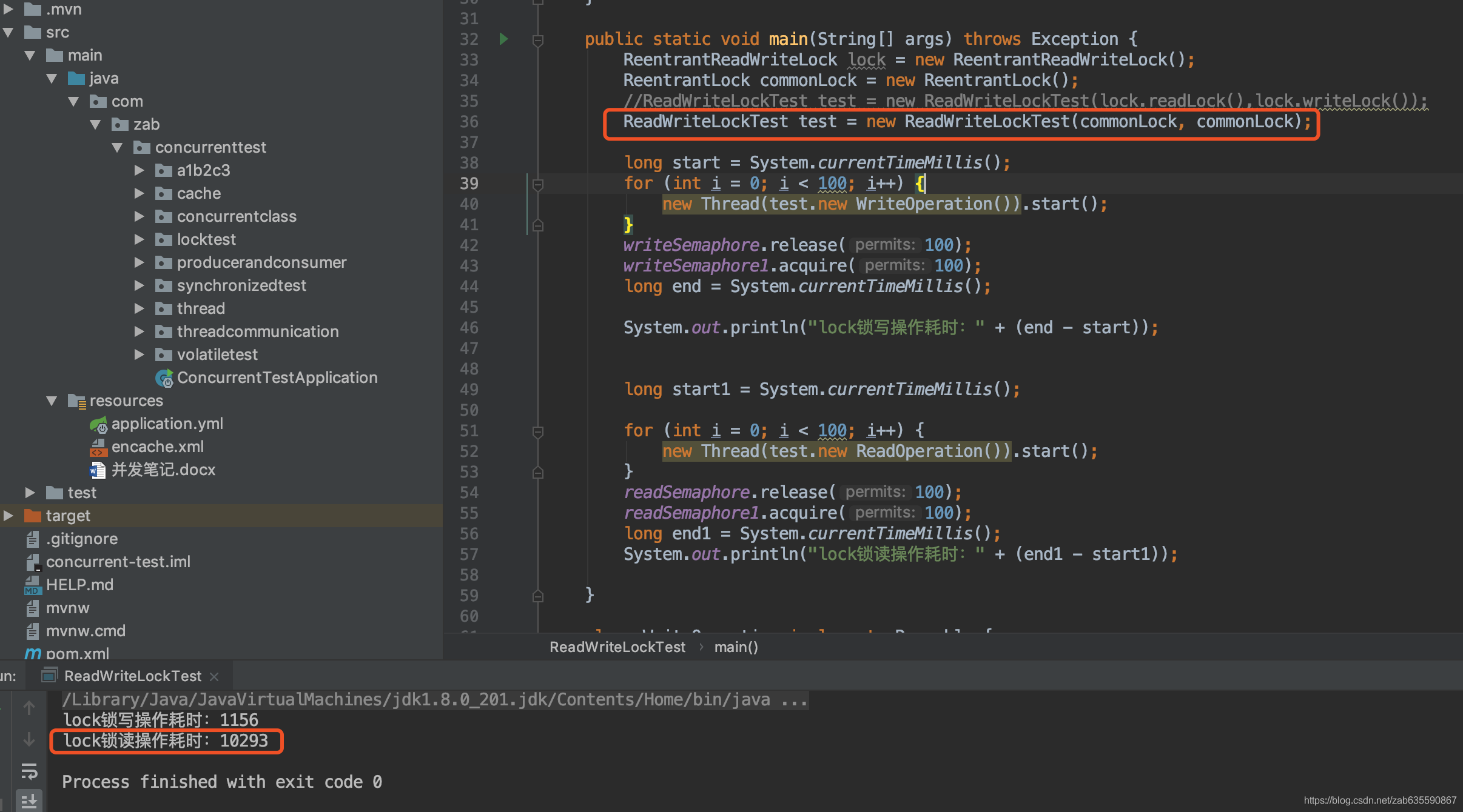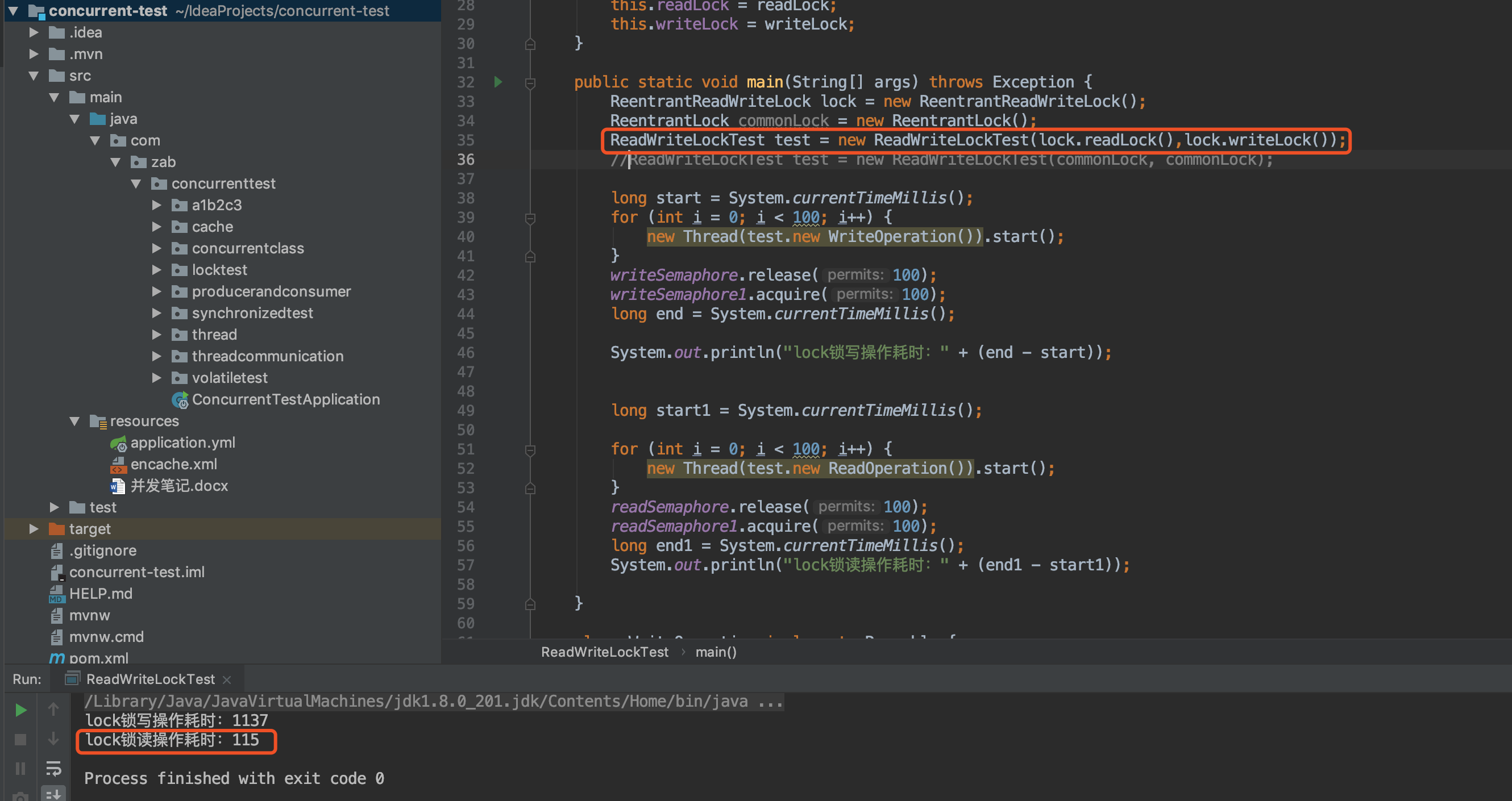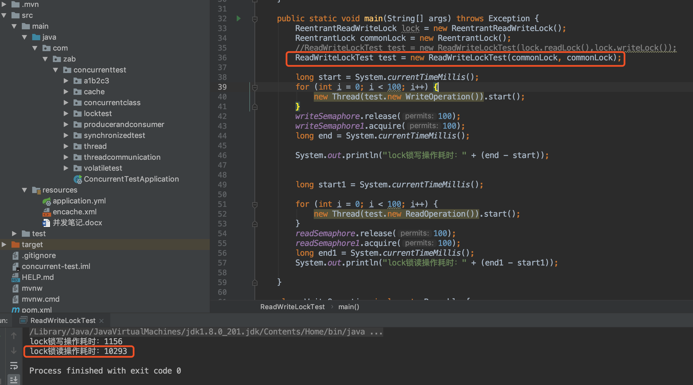 我们用四个信号量精准控制读写操作的进行,记录了读写操作的时间,假设一次写操作耗时10ms,读操作耗时100ms,分别用sleep模拟读写逻辑,同时对读写操作都加锁,锁的初始化可为普通ReentrantLock,可为ReentrantWriteReadLock,对比其效率: