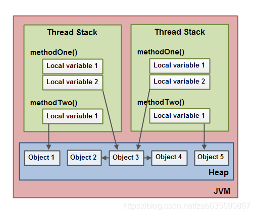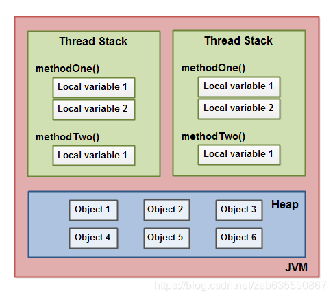 Java虚拟机把Java的内存分为thread stacks和heap,在理解多线程的时候,这种粗糙的分法已足够。