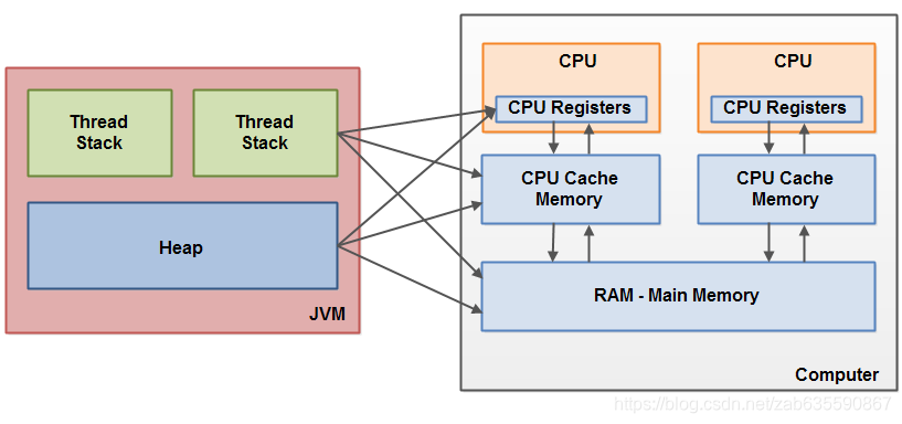 JMM把内存分为堆和栈,计算机的内存又分为主内存、高速缓存、CPU寄存器。