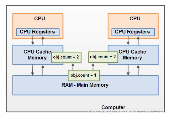 CPU需要读取主内存的时候,通常会把主内存的部分数据读取到缓存中,甚至也可以读到寄存器中,再进行操作。当CPU处理完后,要把结果从寄存器刷新到缓存中,再在某个时候刷新回主内存。