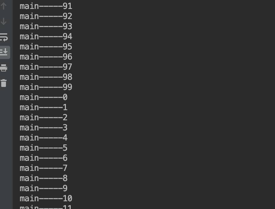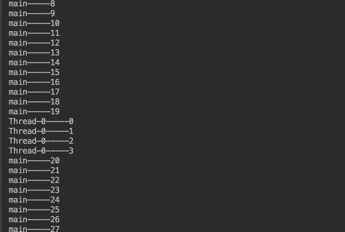 上面的例子中,主线程和MyThread类开的线程会同时打印:线程名字+数字,调用的start方法,表示启动一个线程,启动的线程和主线程并行运行。结果如下: