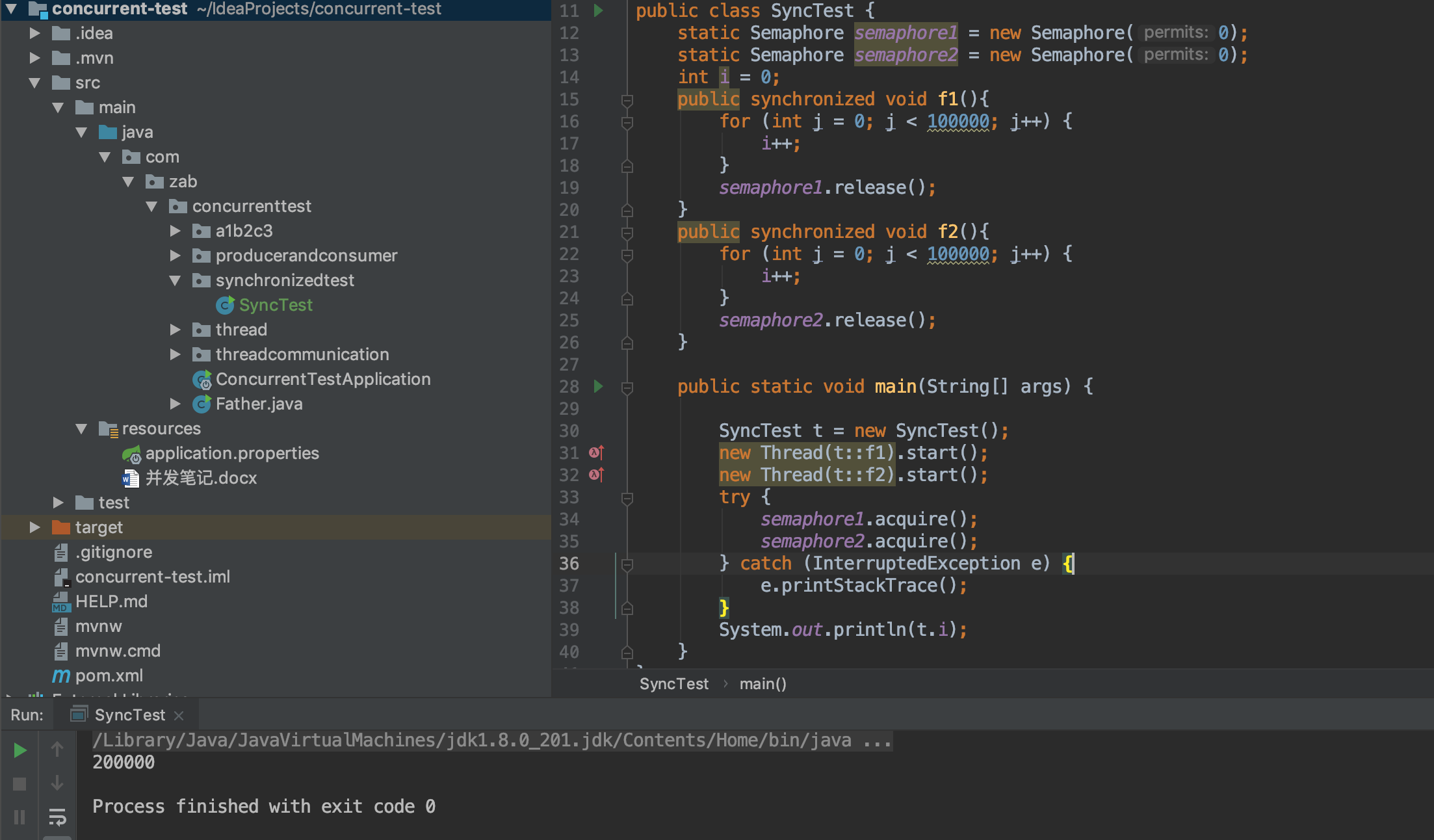 案例中,每个线程都对SyncTest的公有变量i做十万次的自增操作,但是多次结果输出来却不是二十万。Semaphore是信号量,其中acquire方法表示需要一个许可才能继续往下,release方法则是给当前Semaphore对象释放一个许可。这样保证了只有当两个线程都执行完了,才会打印i的值。