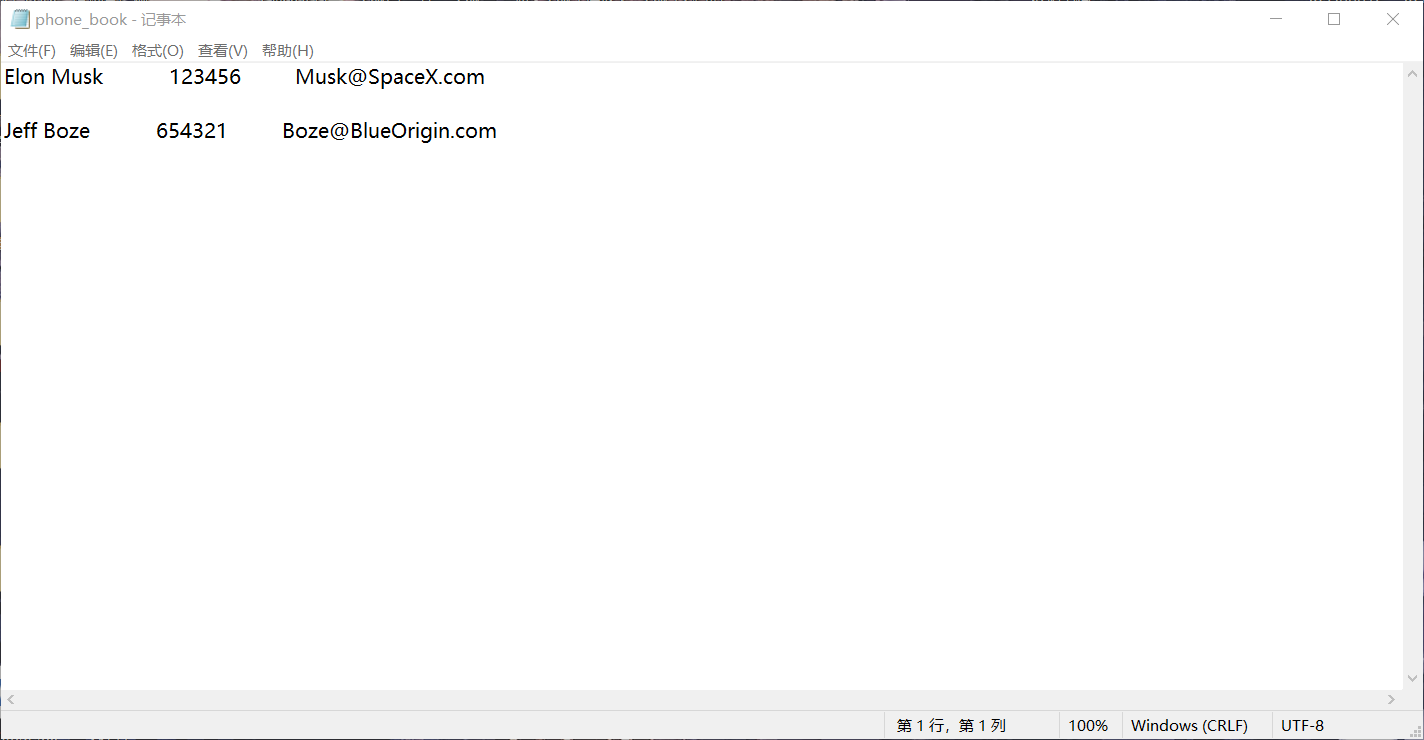 //task2.cpp #include <iostream> #include <fstream> #include <vector> #include "Person.hpp" int main() { using namespace std; vector<Person> phone_book; Person p; while(cin>>p) phone_book.push_back(p); for(auto &i: phone_book) cout << i << endl; cout << boolalpha << (phone_book.at(0) == phone_book.at(1)) << endl; ofstream fout; fout.open("phone_book.txt"); if(!fout.is_open()) { cerr << "fail to open file phone_book.txt\n"; return 1; } for(auto &i: phone_book) fout << i << endl; fout.close(); }