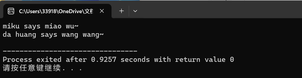 1 #include <iostream> 2 #include <vector> 3 #include "petts.hpp" 4 5 void test() { 6 using namespace std; 7 8 vector<MachinePets *> pets; 9 10 pets.push_back(new PetCats("miku")); 11 pets.push_back(new PetDogs("da huang")); 12 13 for(auto &ptr: pets) 14 cout <<ptr->get_nickname() << " says " << ptr->talk() << endl; 15 } 16 17 int main() { 18 test(); 19 }