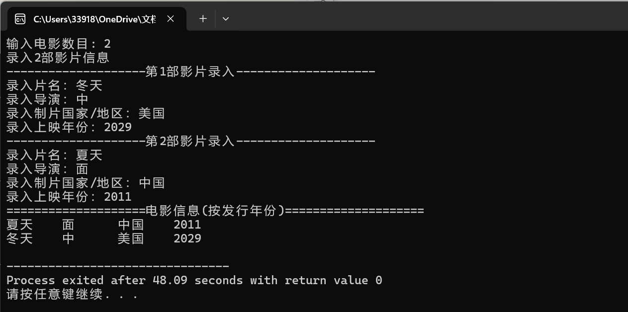 1 #include "petts.hpp" 2 #include <iostream> 3 #include <string> 4 #include <vector> 5 #include <algorithm> 6 //增加这一部分 7 bool compare_by_year(const Film& f1, const Film& f2) { 8 return f1.getYear() < f2.getYear(); // 按年份升序比较 9 } 10 11 void test() { 12 using namespace std; 13 14 int n; 15 cout << "输入电影数目: "; 16 cin >> n; 17 18 cout << "录入" << n << "部影片信息" << endl; 19 vector<Film> film_lst; 20 for(int i = 0; i < n; ++i) { 21 Film f; 22 cout << string(20, '-') << "第" << i+1 << "部影片录入" << string(20, '-') << endl; 23 cin >> f; 24 film_lst.push_back(f); 25 } 26 27 // 按发行年份升序排序 28 sort(film_lst.begin(), film_lst.end(), compare_by_year); 29 30 cout << string(20, '=') + "电影信息(按发行年份)" + string(20, '=')<< endl; 31 for(auto &f: film_lst) 32 cout << f << endl; 33 } 34 35 int main() { 36 test(); 37 }