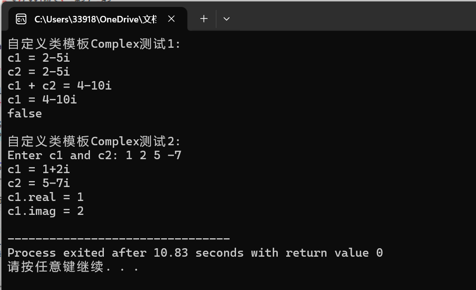 1 #include "petts.hpp" 2 #include <iostream> 3 4 using std::cin; 5 using std::cout; 6 using std::endl; 7 using std::boolalpha; 8 9 void test1() { 10 Complex<int> c1(2, -5), c2(c1); 11 12 cout << "c1 = " << c1 << endl; 13 cout << "c2 = " << c2 << endl; 14 cout << "c1 + c2 = " << c1 + c2 << endl; 15 16 c1 += c2; 17 cout << "c1 = " << c1 << endl; 18 cout << boolalpha << (c1 == c2) << endl; 19 } 20 21 void test2() { 22 Complex<double> c1, c2; 23 cout << "Enter c1 and c2: "; 24 cin >> c1 >> c2; 25 cout << "c1 = " << c1 << endl; 26 cout << "c2 = " << c2 << endl; 27 28 cout << "c1.real = " << c1.get_real() << endl; 29 cout << "c1.imag = " << c1.get_imag() << endl; 30 } 31 32 int main() { 33 cout << "自定义类模板Complex测试1: " << endl; 34 test1(); 35 36 cout << endl; 37 38 cout << "自定义类模板Complex测试2: " << endl; 39 test2(); 40 }
