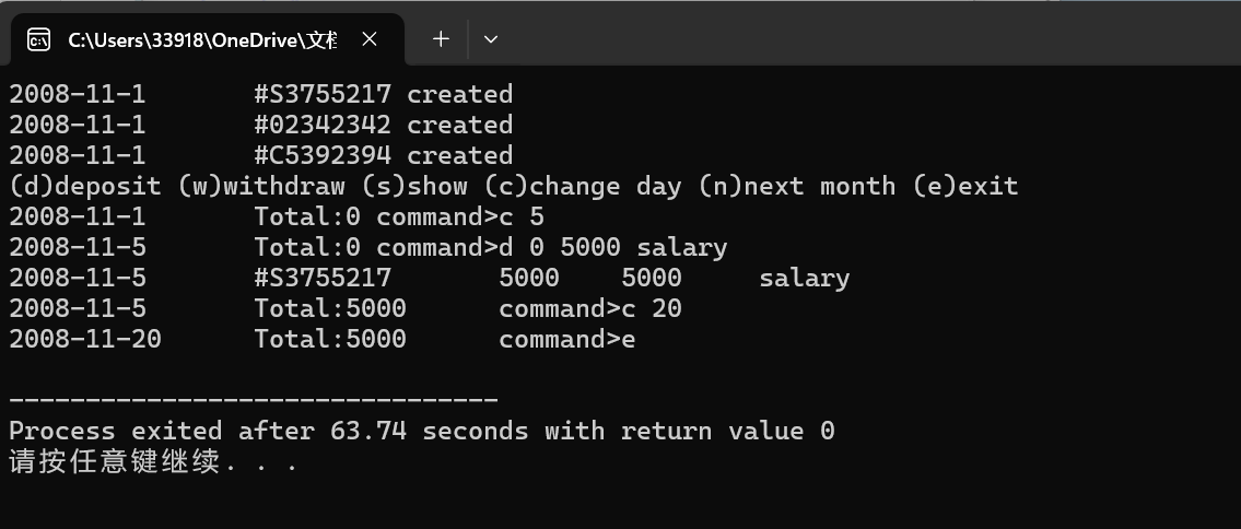 1 #include "account.h" 2 #include<iostream> 3 using namespace std; 4 5 int main() { 6 Date date(2008, 11, 1); 7 8 SavingsAccount sa1(date, "S3755217", 0.015); 9 SavingsAccount sa2(date, "02342342", 0.015); 10 CreditAccount ca(date, "C5392394", 10000, 0.0005, 50); 11 12 Account* accounts[] = { &sa1, &sa2, &ca }; 13 const int n = sizeof(accounts) / sizeof(Account*); 14 15 cout << "(d)deposit (w)withdraw (s)show (c)change day (n)next month (e)exit" << endl; 16 char cmd; 17 do { 18 date.show(); 19 cout << "\tTotal:" << Account::getTotal() << "\tcommand>"; 20 21 int index, day; 22 double amount; 23 string desc; 24 cin >> cmd; 25 26 switch (cmd) { 27 case 'd': 28 cin >> index >> amount; 29 getline(cin, desc); 30 accounts[index]->deposit(date, amount, desc); 31 break; 32 33 case 'w': 34 cin >> index >> amount; 35 getline(cin, desc); 36 accounts[index]->withdraw(date, amount, desc); 37 break; 38 39 case 's': 40 for (int i = 0; i < n; i++) { 41 cout << "[" << i << "]"; 42 accounts[i]->show(); 43 cout << endl; 44 } 45 break; 46 47 case 'c': 48 cin >> day; 49 if (day < date.getDay()) { 50 cout << "You cannot specify a previous day"; 51 } 52 else if (day > date.getMaxDay()) 53 cout << "Invalid day"; 54 else date = Date(date.getYear(), date.getMonth(), day); 55 break; 56 57 case 'n': 58 if (date.getMonth() == 12) 59 date = Date(date.getYear() + 1, 1, 1); 60 else date = Date(date.getYear(), date.getMonth() + 1, 1); 61 for (int i = 0; i < n; i++) { 62 accounts[i]->settle(date); 63 } 64 break; 65 } 66 67 } while (cmd != 'e'); 68 69 return 0; 70 }