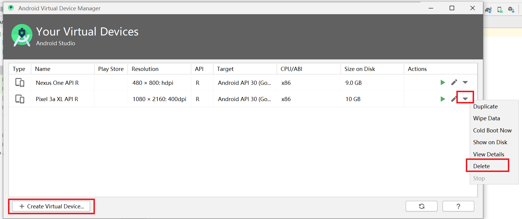 (2)点击左下角“Create Virtual Device” (已有的虚拟机可以如图点击“Delete”来删除)