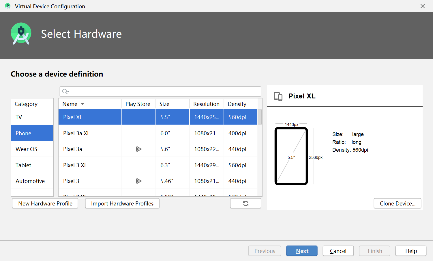 右边category为设备种类,中间为设备的大小尺寸,任意选择一个点击next