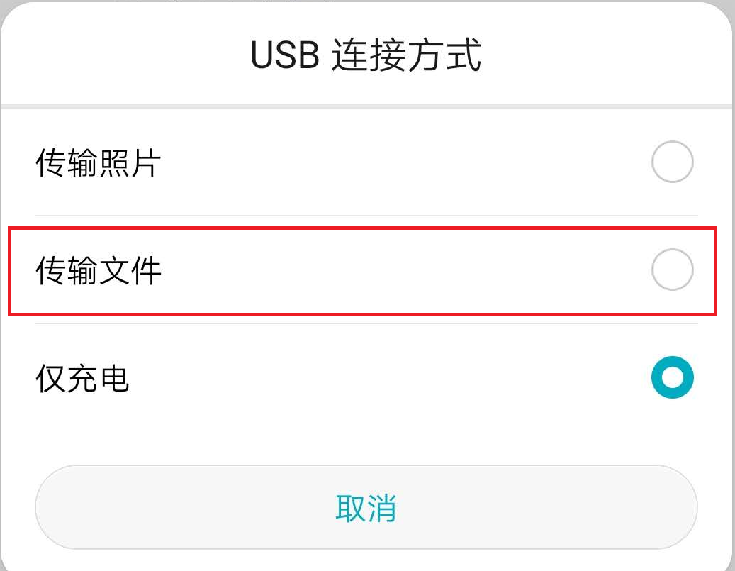 (1)用USB数据线连接手机和电脑,在弹出的连接方式选择传输文件