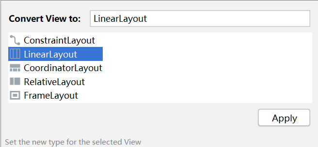 选择:[ 约束布局ConostraintLayout | 协调布局CoordinatorLayout | 线性布局LinearLayout | 相对布局RelativeLayout |