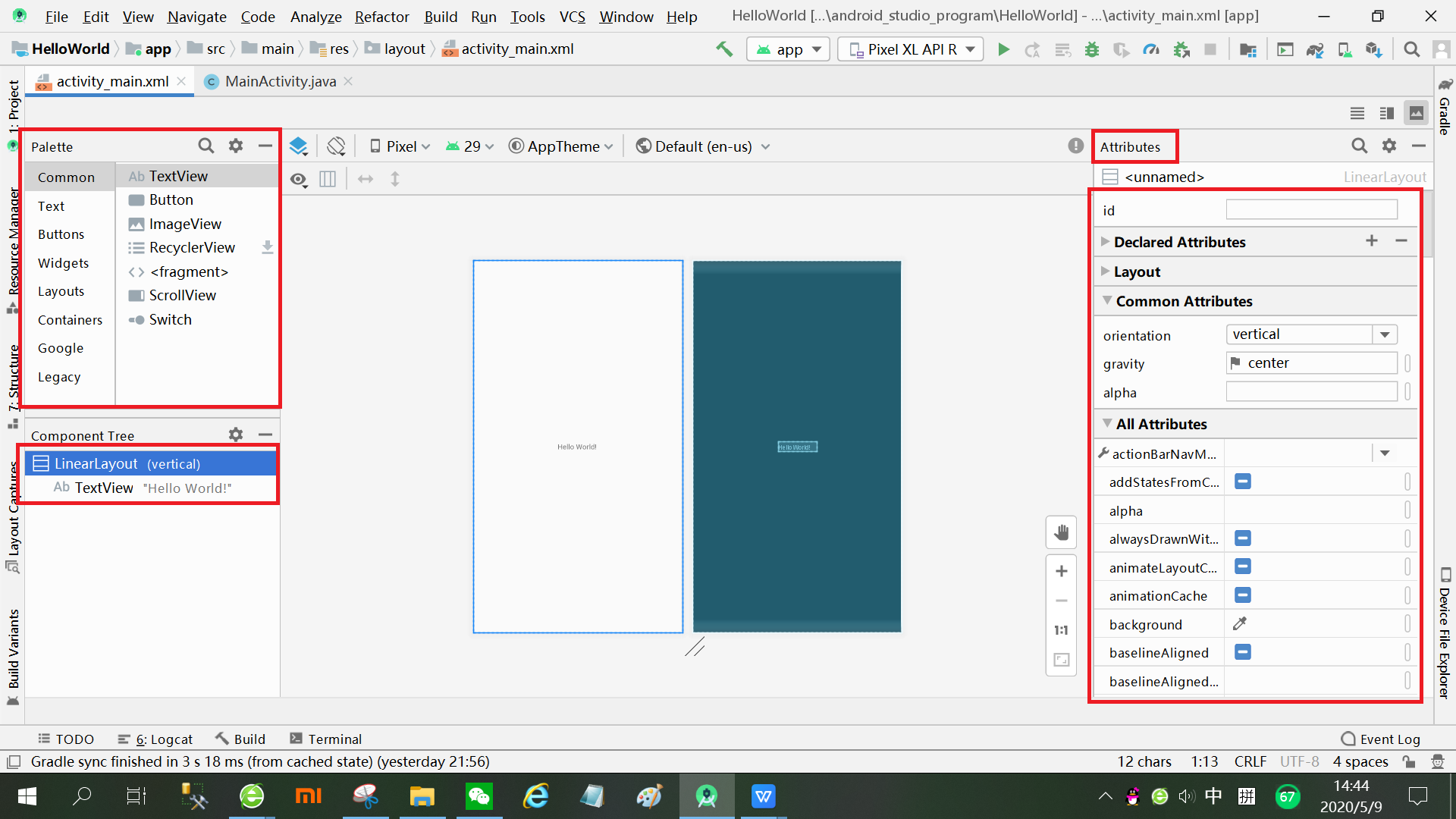 因为empty activity里有一个自动生成的activity_main.xml布局文件,所以我们可以直接修改该布局,右上角切换代码和设计视图