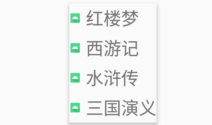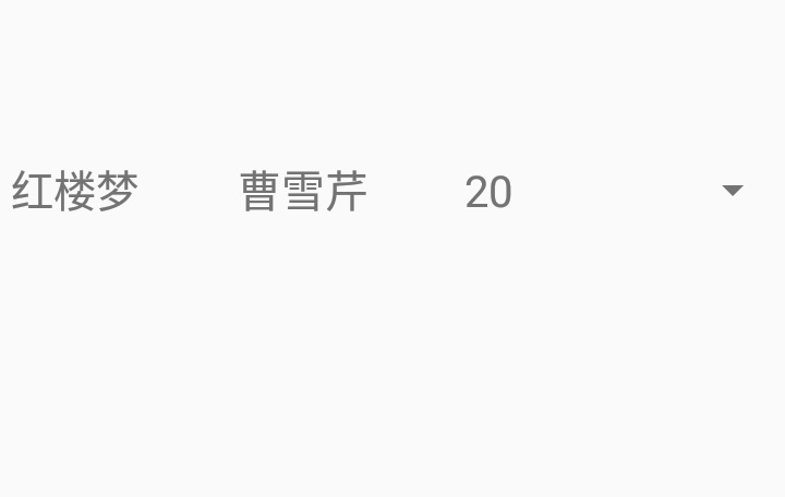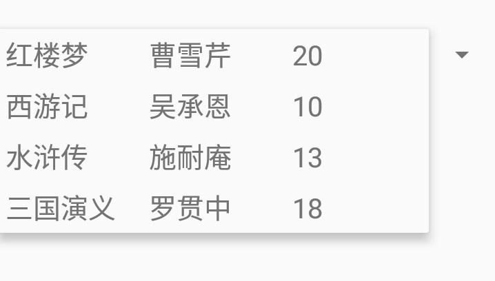public class MainActivity extends AppCompatActivity { //先设置列表项key[即“属性”] String[] keys={"bname","bauthor","bamount"}; //再设置每个列表项的values [即“属性值”] String[] bname={"红楼梦","西游记","水浒传","三国演义"}; String[] bauthor={"曹雪芹","吴承恩","施耐庵","罗贯中"}; int[] bamount={20,10,13,18}; //item代表一条记录 Map<String,Object> item=null; //wholedata用来存放所有记录,形成一个表List List<Map<String,Object>> wholedata=new ArrayList<Map<String,Object>>(); //ids为整型数组,存放myspinner_layout.xml里三个textView的id int[] ids={R.id.t1,R.id.t2,R.id.t3}; @Override protected void onCreate(Bundle savedInstanceState) { super.onCreate(savedInstanceState); setContentView(R.layout.activity_main); int i,valuesNum; //valuesNum为总记录数(表中一行是一条记录) valuesNum=bname.length; //添加记录 for(i=0;i<valuesNum;i++){ item=new HashMap<>(); item.put(keys[0],bname[i]); item.put(keys[1],bauthor[i]); item.put(keys[2],bamount[i]); wholedata.add(item); } //为spinner设置SimpleAdapter Spinner myspinner=findViewById(R.id.spinner); //SimpleAdapter(Context context,List<Map<String,?>> data,int LayoutResource,String[] from,int[] idRes) SimpleAdapter myAdapter=new SimpleAdapter(this,wholedata,R.layout.myspinner_layout,keys,ids); myspinner.setAdapter(myAdapter); } }