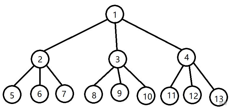 首先来看节点的编号,从上到下,从左到右依次给树上的节点进行编号,容易发现,设一个非叶子节点的编号为 \(x\),则它的三个儿子节点的编号为 \(3x-1,3x,3x+1\),配一张图方便大家理解(图微丑,轻喷)。