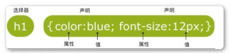 CSS规则由两个主要的部分构成:选择器,以及一条或多条声明