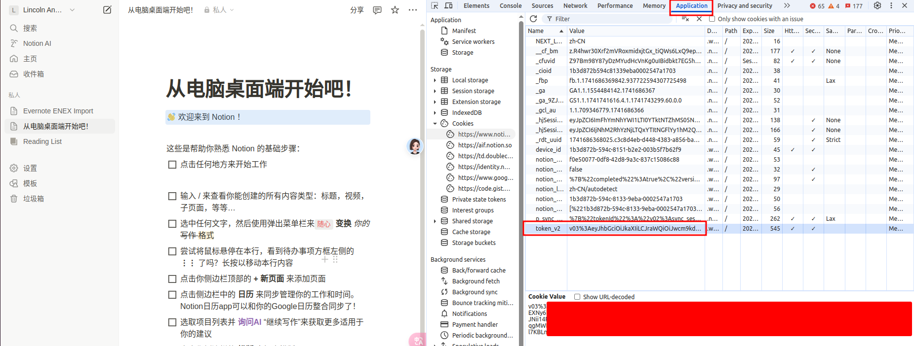 登录https://www.notion.so,右键检查元素,刷新页面,找到应用选项页里的token-v2,复制详细内容。