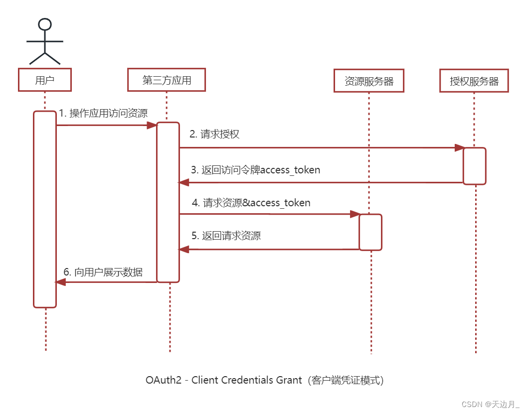 - 【步骤9,10】客户端持有访问令牌(access_token)和需要请求的参数向客户端服务器发起资源请求,然后客户端服务器再向服务提供商的资源服务器请求资源(web API)。