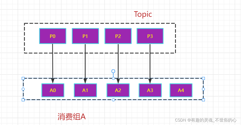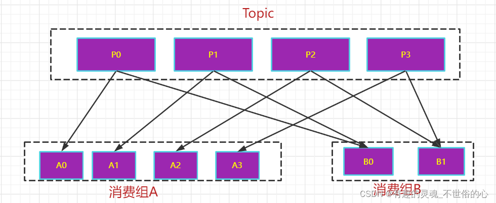 假设某个主题,共有4各分区P0,P1,P2,P3,有两个消费组,消费组A共4各消费者:A0,A1,A2,A3, 消费组B共有2个消费者:B0,B1