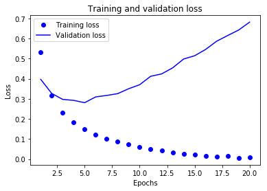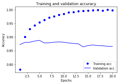 Train on 15000 samples, validate on 10000 samples Epoch 1/20 15000/15000 [==============================] - 2s 155us/step - loss: 0.5305 - acc: 0.7811 - val_loss: 0.3971 - val_acc: 0.87 Epoch 2/20 15000/15000 [==============================] - 2s 143us/step - loss: 0.3182 - acc: 0.9001 - val_loss: 0.3270 - val_acc: 0.88 Epoch 3/20 15000/15000 [==============================] - 2s 144us/step - loss: 0.2300 - acc: 0.9287 - val_loss: 0.2972 - val_acc: 0.880 Epoch 4/20 15000/15000 [==============================] - 2s 144us/step - loss: 0.1815 - acc: 0.9421 - val_loss: 0.2923 - val_acc: 0.88 Epoch 5/20 15000/15000 [==============================] - 2s 143us/step - loss: 0.1481 - acc: 0.9531 - val_loss: 0.2807 - val_acc: 0.887 Epoch 6/20 15000/15000 [==============================] - 2s 148us/step - loss: 0.1227 - acc: 0.9624 - val_loss: 0.3096 - val_acc: 0.878 Epoch 7/20 15000/15000 [==============================] - 2s 143us/step - loss: 0.1021 - acc: 0.9709 - val_loss: 0.3169 - val_acc: 0.87 Epoch 8/20 15000/15000 [==============================] - 2s 144us/step - loss: 0.0872 - acc: 0.9751 - val_loss: 0.3257 - val_acc: 0.88 Epoch 9/20 15000/15000 [==============================] - 2s 144us/step - loss: 0.0724 - acc: 0.9814 - val_loss: 0.3503 - val_acc: 0.882 Epoch 10/20 15000/15000 [==============================] - 2s 143us/step - loss: 0.0610 - acc: 0.9846 - val_loss: 0.3702 - val_acc: 0.88 Epoch 11/20 15000/15000 [==============================] - 2s 143us/step - loss: 0.0489 - acc: 0.9901 - val_loss: 0.4122 - val_acc: 0.878 Epoch 12/20 15000/15000 [==============================] - 2s 144us/step - loss: 0.0417 - acc: 0.9915 - val_loss: 0.4241 - val_acc: 0.876 Epoch 13/20 15000/15000 [==============================] - 2s 147us/step - loss: 0.0327 - acc: 0.9947 - val_loss: 0.4542 - val_acc: 0.87 Epoch 14/20 15000/15000 [==============================] - 2s 145us/step - loss: 0.0272 - acc: 0.9951 - val_loss: 0.4983 - val_acc: 0.86 Epoch 15/20 15000/15000 [==============================] - 2s 147us/step - loss: 0.0213 - acc: 0.9965 - val_loss: 0.5144 - val_acc: 0.86 Epoch 16/20 15000/15000 [==============================] - 2s 147us/step - loss: 0.0171 - acc: 0.9975 - val_loss: 0.5459 - val_acc: 0.870 Epoch 17/20 15000/15000 [==============================] - 2s 152us/step - loss: 0.0123 - acc: 0.9985 - val_loss: 0.5868 - val_acc: 0.868 Epoch 18/20 15000/15000 [==============================] - 2s 146us/step - loss: 0.0146 - acc: 0.9967 - val_loss: 0.6150 - val_acc: 0.867 Epoch 19/20 15000/15000 [==============================] - 2s 145us/step - loss: 0.0056 - acc: 0.9996 - val_loss: 0.6424 - val_acc: 0.865 Epoch 20/20 15000/15000 [==============================] - 2s 150us/step - loss: 0.0089 - acc: 0.9979 - val_loss: 0.6818 - val_acc: 0.865