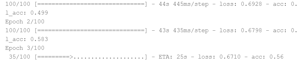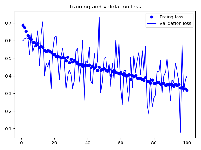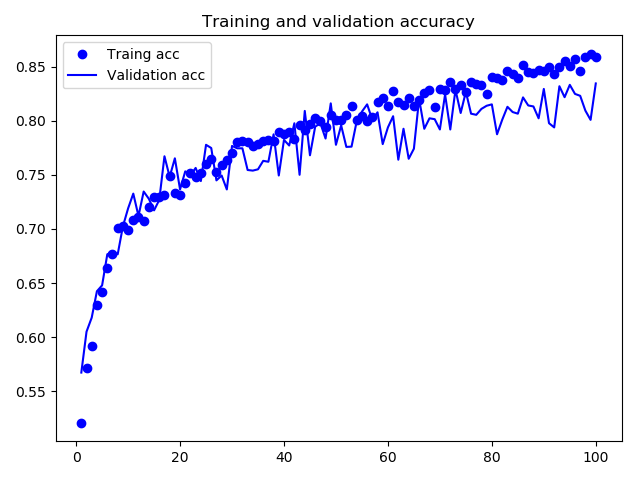 from keras import models from keras import layers from keras import optimizers from keras.preprocessing.image import ImageDataGenerator import matplotlib.pyplot as plt model = models.Sequential() model.add(layers.Conv2D(32, (3, 3), activation='relu', input_shape=(150, 150, 3))) model.add(layers.MaxPooling2D((2, 2))) model.add(layers.Conv2D(64, (3, 3), activation='relu')) model.add(layers.MaxPooling2D((2, 2))) model.add(layers.Conv2D(128, (3, 3), activation='relu')) model.add(layers.MaxPooling2D((2, 2))) model.add(layers.Conv2D(128, (3, 3), activation='relu')) model.add(layers.MaxPooling2D((2, 2))) model.add(layers.Flatten()) model.add(layers.Dropout(0.5)) model.add(layers.Dense(512, activation='relu')) model.add(layers.Dense(1, activation='sigmoid')) print('--------------------------------------------------------------', model.summary()) model.compile(loss='binary_crossentropy', optimizer=optimizers.RMSprop(lr=1e-4), metrics=['acc']) train_dir = '/home/aistudio/data/datasets_small/train' validation_dir = '/home/aistudio/data/datasets_small/validation' train_datagen = ImageDataGenerator( rescale=1./255, rotation_range=40, width_shift_range=0.2, height_shift_range=0.2, shear_range=0.2, zoom_range=0.2, horizontal_flip=True,) test_datagen = ImageDataGenerator(rescale=1./255) train_generator = train_datagen.flow_from_directory( train_dir, target_size=(150, 150), batch_size=32, class_mode='binary') validation_generator = test_datagen.flow_from_directory( validation_dir, target_size=(150, 150), batch_size=32, class_mode='binary') history = model.fit_generator( train_generator, steps_per_epoch=100, epochs=100, validation_data=validation_generator, validation_steps=50 ) model.save('cat_and_dog_small_2.h5') acc = history.history['acc'] val_acc = history.history['val_acc'] loss = history.history['loss'] val_loss = history.history['val_loss'] epochs = range(1, len(acc)+1) plt.plot(epochs, acc, 'bo', label='Traing acc') plt.plot(epochs, val_acc, 'b', label='Validation acc') plt.title('Training and validation accuracy') plt.legend() plt.figure() plt.plot(epochs, loss, 'bo', label='Traing loss') plt.plot(epochs, val_loss, 'b', label='Validation loss') plt.title('Training and validation loss') plt.legend() plt.show()