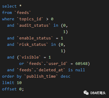 select * from `feeds` where `topics_id` > 0 and `audit_status` in (0, 1) and `enable_status` = 1 and `risk_status` in (0, 1) and (`visible` = 1 or `feeds`.`user_id` = 60548) and `feeds`.`deleted_at` is null order by `publish_time` desc limit 10 o