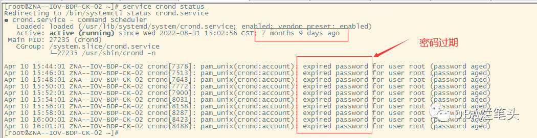 crond为 active 且 启动在 7 months 9 days ago,但是有信息显示 expired password for user root,任务没有如期执行原因指向 root 密码过期。