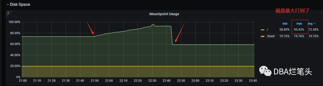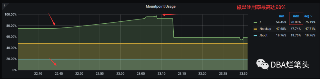 2023-06-26 22:17左右,收到某系统的主库磁盘使用率告警。2023-06-26 23:02左右收到该系统的从库磁盘使用率告警。