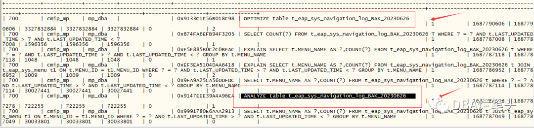 通过proxysql中间件获取t_eap_sys_navigation_log_bak_20230626的操作记录,该表的确存在 OPTIMIZE table 与 ANALYZE table 行为。