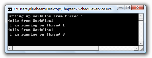 本例中我们有两个工作流Runtime。我们将runtime1的调度服务配置为手工调度器,而runtime2的调度服务则不做显式配置,所以runtime2将使用默认调度器。我们的代码在执行这两个工作流之前输出了当前的线程ID,然后在工作流的执行过程中再输出工作流的线程ID。