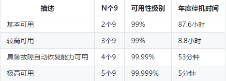 在业界有一套比较出名的评定网站可用性的指标,常用 N 个 9 来量化可用性,可以直接映射到网站正常运行时间的百分比上: