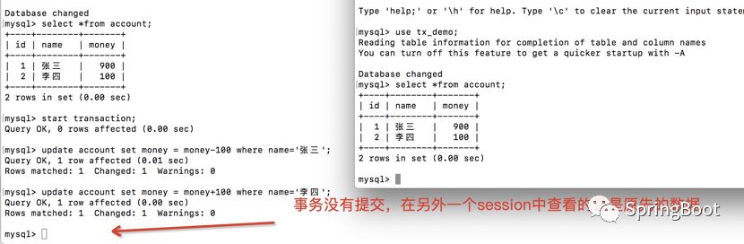 张三给李四转账,如果事务没有提交的话,那么在另外一个session中并不能查看另外一个session未提交的数据。