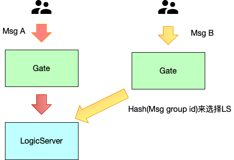 上图中,根据群聊消息的群ID来选择逻辑服务器,这样同一个群的消息都能落在同一个服务器中来处理了。