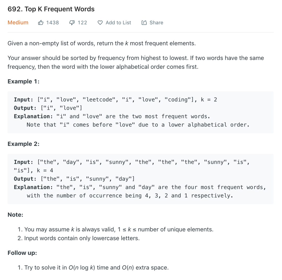 比如说 “I love leetcode, I love coding” 中频率最高的 2 个就是 I 和 love 了。