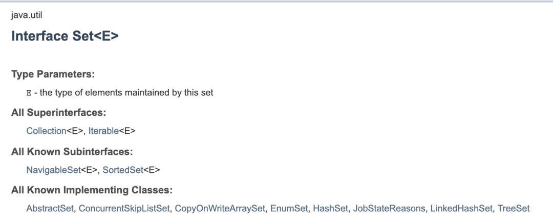 Set 在 Java 中是一个接口,可以看到它是 java.util 包中的一个集合框架类,具体的实现类有很多: