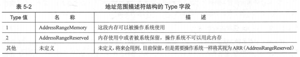 每个字段都是4个字节,一共20字节。每次0x15后BIOS都会返回一个这样的结构。其中的type用来描述内存的类型: