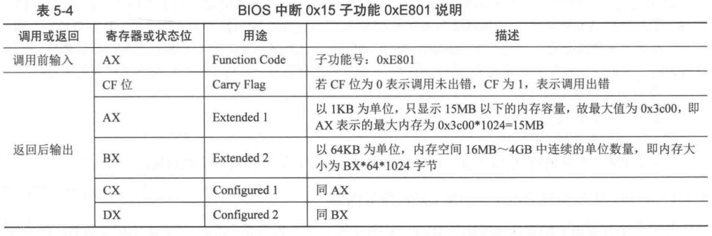 这个方法最大只能识别4GB的内存,分两组寄存器存放结果,低15MB内存以1KB为单位,大小存放在AX和CX寄存器中,两个寄存器的值是一样的,最大0x3c00,即0x3c00 * 1024 = 15MB;16MB-4GB的部分是以64KB为单位的(中间15-16MB是缺的,后面会讲),大小存放在BX和DX寄存器中,两个寄存器的值也是一样的。