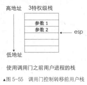 对于调用门,如何通过选择子索引gdt/ldt就不讲了,这里介绍一下调用门下如何为内核例程传参。由于在调用时,不同特权级使用各自的栈,调用者把参数压入自己的栈中,被调用者或者说内核例程的栈里并没有参数,怎么办呢?CPU已经提供了对应的机制,将在调用者栈中的参数赋值到被调者的栈中。通过门描述符的参数个数字段来确定几个参数,最多传31个参数。