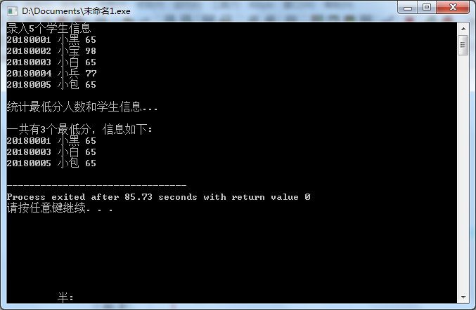 #include <stdio.h> const int N=5; // 定义结构体类型struct student,并定义STU为其别名 typedef struct student { long no; char name[20]; int score; }STU; // 函数声明 void input(STU s[], int n); int findMinlist(STU s[], STU t[], int n); void output(STU s[], int n); int main() { STU stu[N], minlist[N]; int count; printf("录入%d个学生信息\n", N); input(stu, N); printf("\n统计最低分人数和学生信息...\n"); count = findMinlist(stu, minlist, N); printf("\n一共有%d个最低分,信息如下:\n", count); output(minlist, count); return 0; } // 输入n个学生信息,存放在结构体数组s中 void input(STU s[], int n) { int i; for(i=0; i<n; i++) scanf("%ld %s %d", &s[i].no, s[i].name, &s[i].score); } // 输出结构体s中n个元素信息 void output(STU s[], int n) { int i; for(i=0; i<n; i++) printf("%ld %s %d\n", s[i].no, s[i].name, s[i].score); } // 在结构体数组s中,查找最低分学生的记录,将其存入结构体数组s中 // 形参n是结构体数组s中元素个数 // 函数返回最低分的学生人数 int findMinlist(STU s[], STU t[], int n) { int i ,min,j=0; min=s[0].score; for(i=0;i<n;i++){ if(s[i].score<min){ min=s[i].score; } } for(i=0;i<n;i++){ if(s[i].score==min){ t[j++]=s[i]; } } return j; }