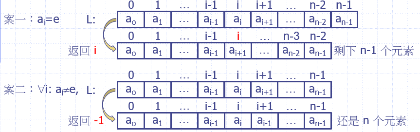 delete(L, e) : 从 L 删除元素 e。搜寻第一个等于 e 的元素位置,假设为 i,将位置 i 之后的元素往前移一个位置,返回 i 的值。若 L 没有任何元素等于 e, 返回 -1。下图 n 为线性表元素个数。
