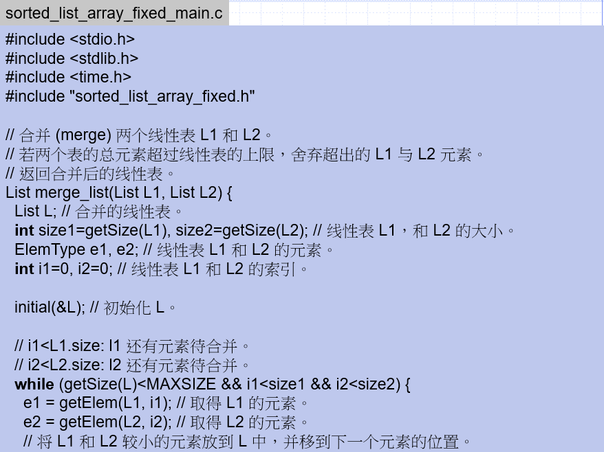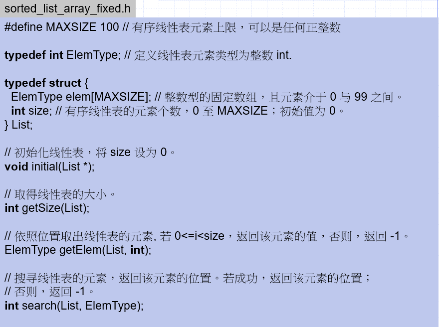 在 C 程序语言可使用数组 (array) 实现有序线性表:
