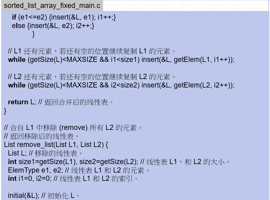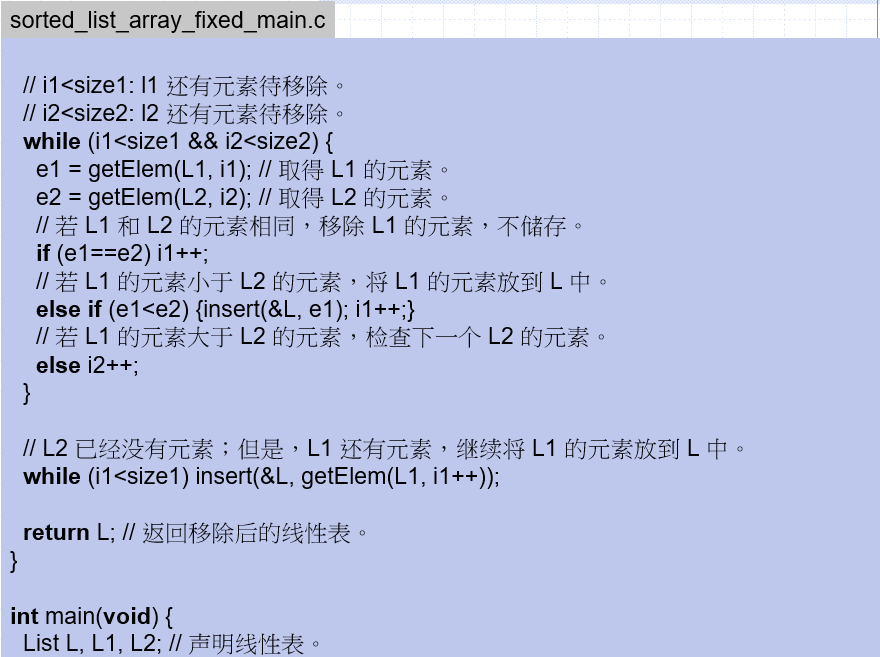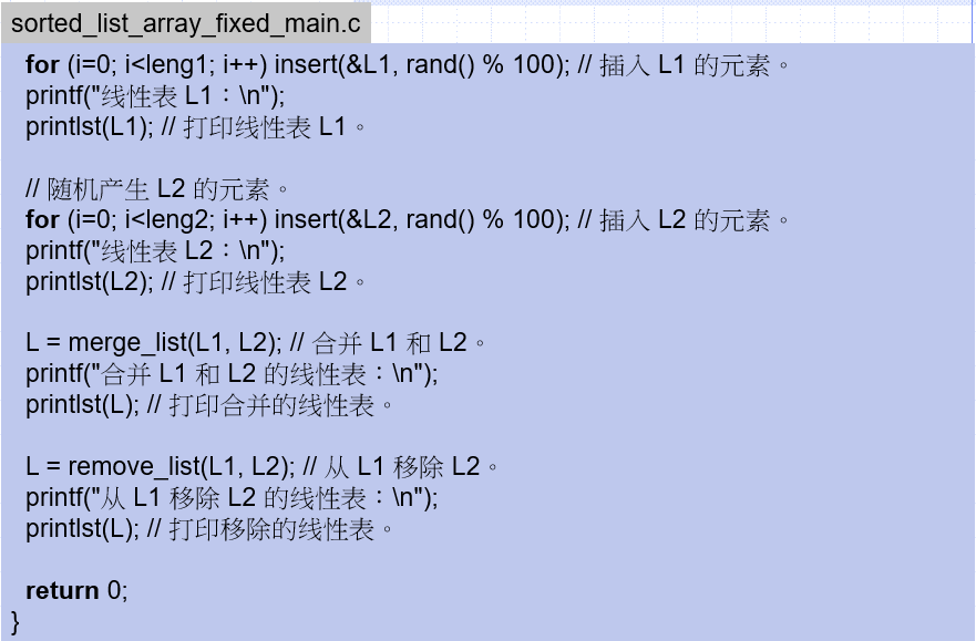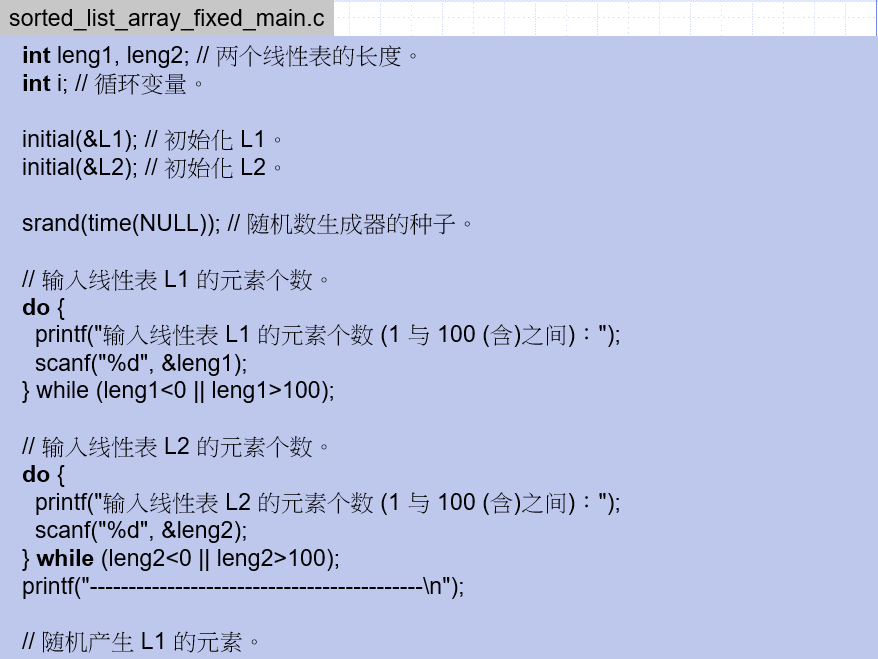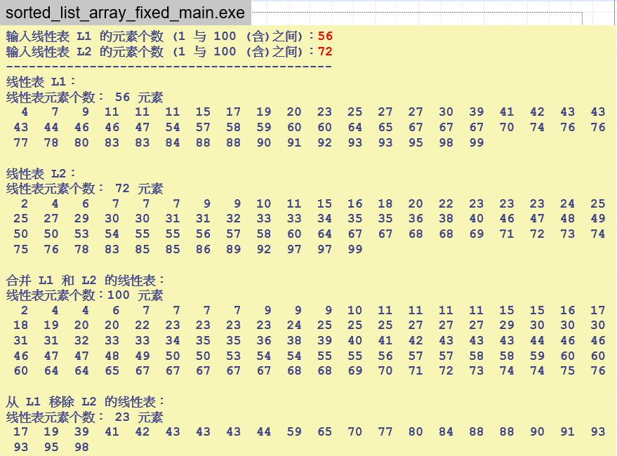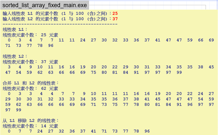 假设线性表的元素是介于 0 与 99 之间的随机整数,且线性表最多是 100 个元素。写一个 C 程序语言的程序实现固定数组的有序线性表。主程序中,创建两任意长度的线性表 L1 与 L2,打印两个线性表。(1) 将 L1 和 L2 合并 (merge);若两个表的总元素超过线性表的上限,舍弃超出的 L1 与 L2 元素;打印合并后的线性表。(2) 自 L1 中移除 (remove) 所有 L2 的元素;打印移除后的线性表。
