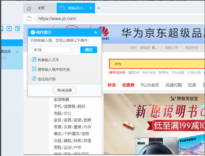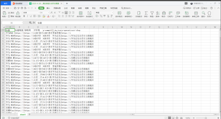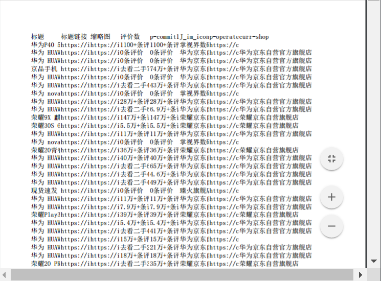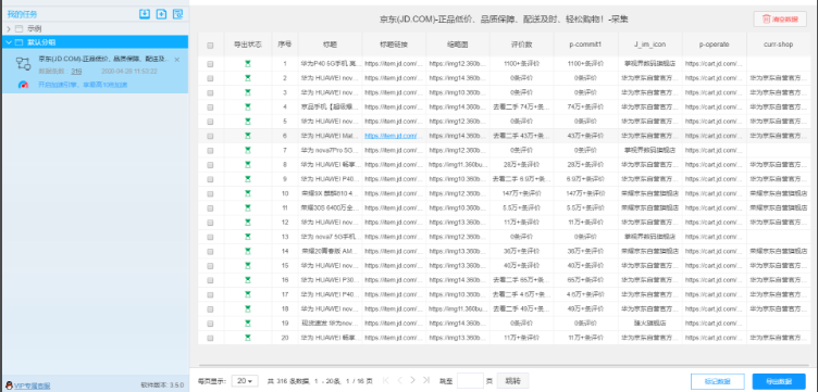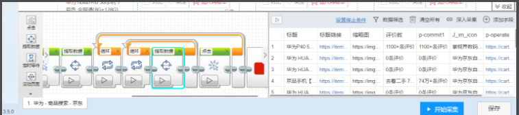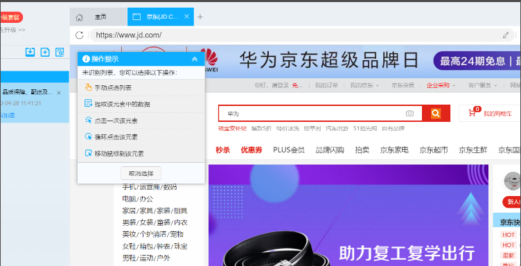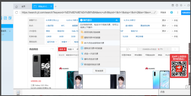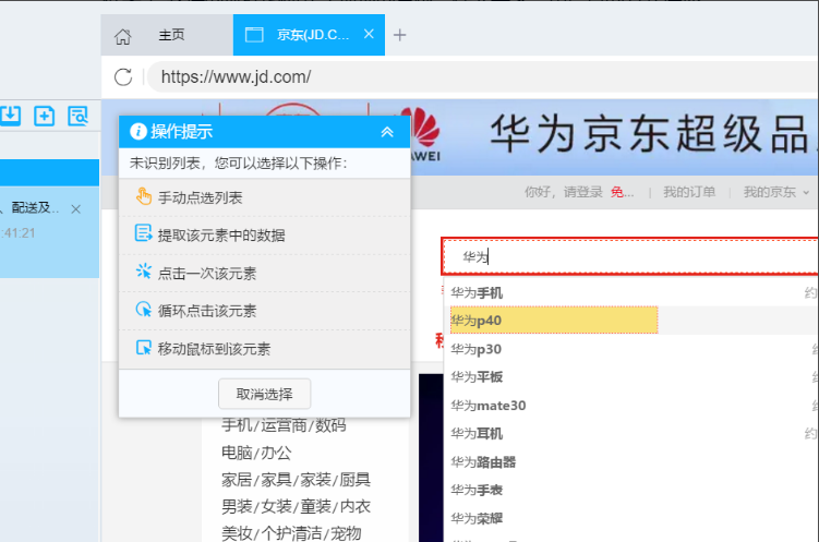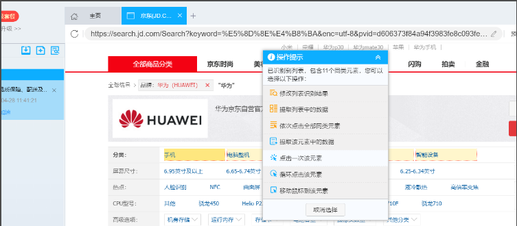 进入京东商城采集有关华为手机的所有型号,在搜索栏中键入华为,后点击搜索按钮元素一次,后点击手机分类选项,提取列表中有关华为手机的数据,并进行采集以及导出的数据。