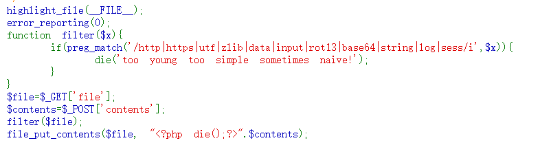 content内容就会先进行一个base64解码在传入,这里是base64只会解码b ,ase64编码后可能出现的字母(数字,字母和+ / =),所以加入的<? ;?>会被无视掉,base64是将3个字符24位转化位4个字符,反过来就是将4个字符传化位3个字符,这里除了特殊符号就是phpdie6个字符,因此要加上两个字符构成4的倍数来“吃掉”前面字符,后面加上想执行指令的base64密文即可