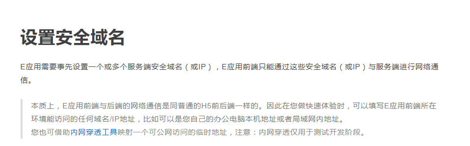 我在其它博客里面有写过,钉钉是不能直接跳转到外部页面的,只能通过调用dd.navigateTo 方法来跳转到E应用的其他页面,而这个页面利用Webview组件就可以放置外部页面,自动铺满E应用。在开发时,我们都是需要跳转到自己开发的系统上,自己的系统都是内网的IP,而此时如果我们没有在Webview安全域名这里面事先配置我们本机的IP地址,结果就会出现我们在模拟机上可以跳转到自研系统,但是发布到钉钉上去后,就会出现真机上打不开。其他网站同理,一样要配置对应的域名/IP地址。