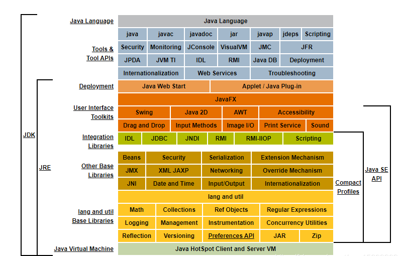 Write Once,Run Anywhere 正是由于这两项提供的支持才得以实现,而 Java Virtual Machine,JVM 是 Java 实现跨平台目标的核心部分。以下为部分 Java SE API 截图